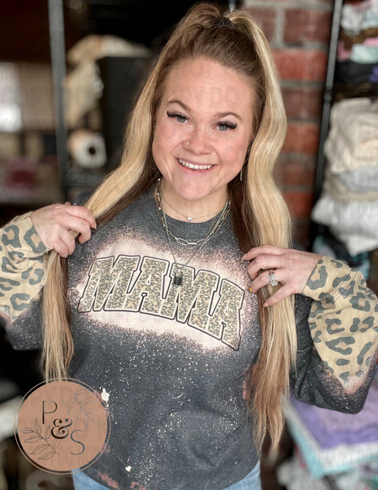 Mama Distressed Leopard - Bleached Dark Heather Sweatshirt With Printed Sleeve
